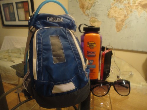 Gear.  Wear light, loose-fitting, and breathable clothing.  Avoid black.  Always wear a pair of sunglasses to protect your eyes.  Never forget sun block.  I always forget this and I come home looking like a lobster.  I don’t typically wear a hat because it can trap heat and cause your body temperature to rise.  I wear a thick headband, but there are running caps you can buy in any sports store.  Take your cell phone in case of an emergency.  I have my iphone with me so I can listen to motivating jams or audio books.  You can even learn another language while you’re running.  I’m going to start that next time.  It keeps my mind off the heat.