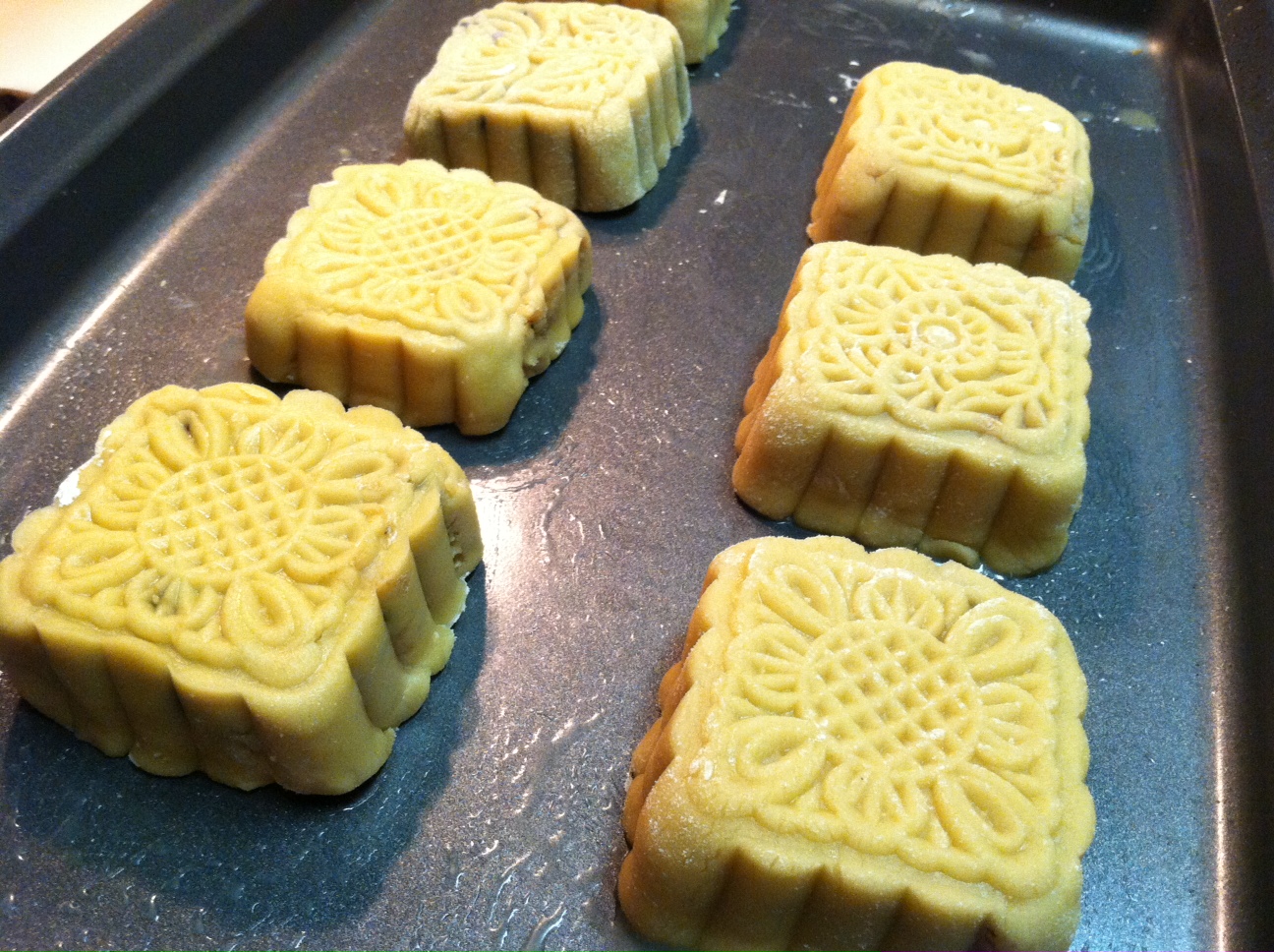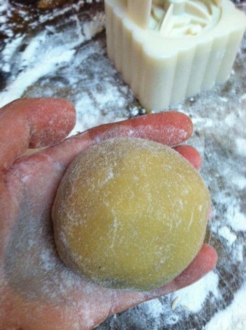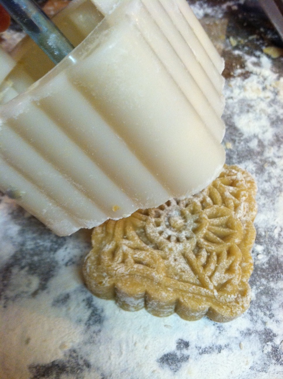 1. Before you start, dust your cutting board and the mooncake mold with flour. Also, spray or oil your baking pan.