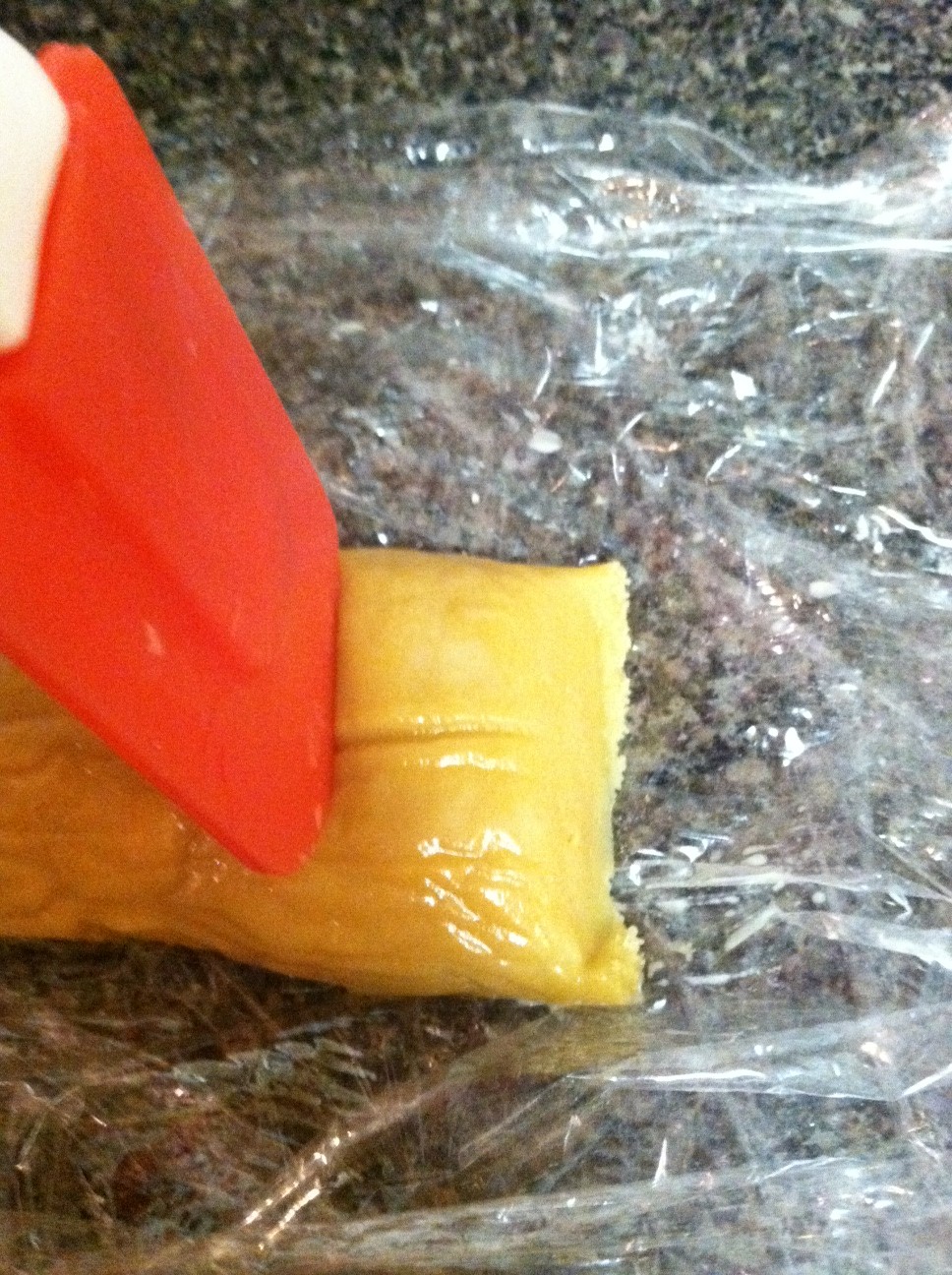 7. Roll it into a log and wrap it with plastic wrap. It’s difficult to form the filling in the dough within a day (texture is not there yet), so you want to place it in the fridge overnight. For best results, leave it in the fridge for 2 days.