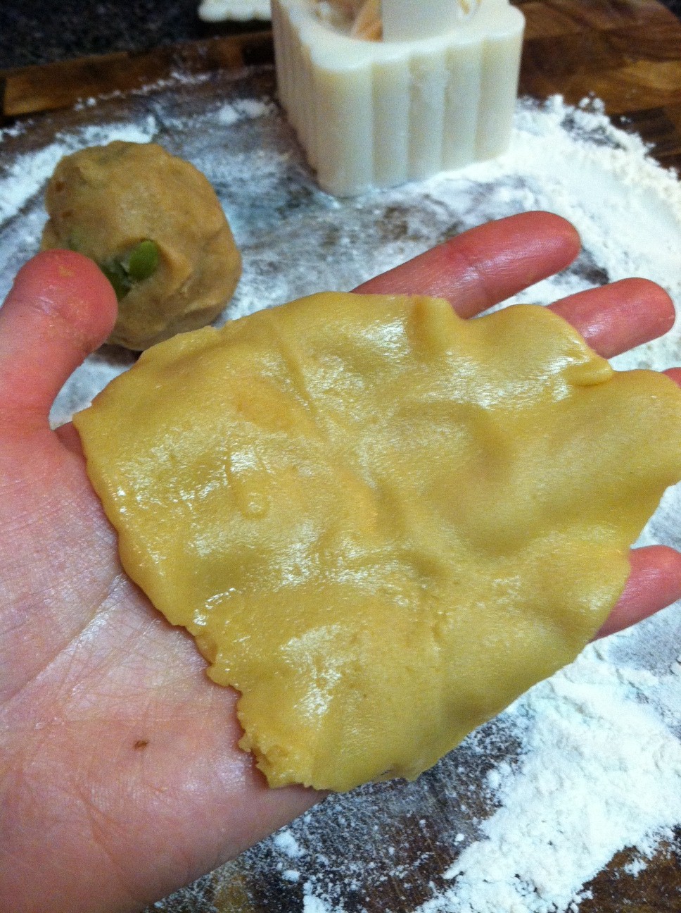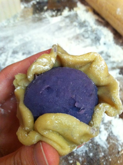 5. Place the filling in the center of your outer dough and carefully wrap the filling with your fingertips.
