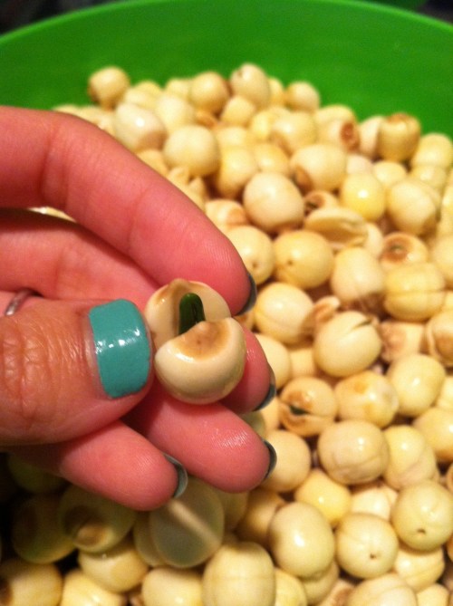 2. Now you want to remove the green root in the middle of the seeds because it’s bitter. You may need a partner for this. Simply pinch the seed and you’ll see the green root. Remove and keep the halves of the seeds.