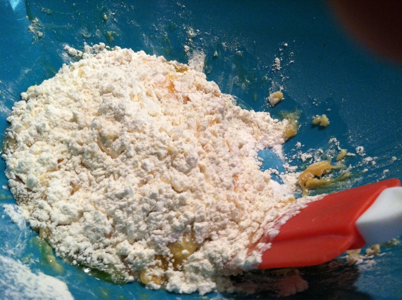 3. Carefully take a rubber spatula and pour the flour from the sides into the middle of the crater.